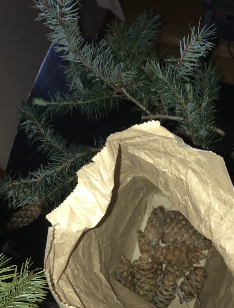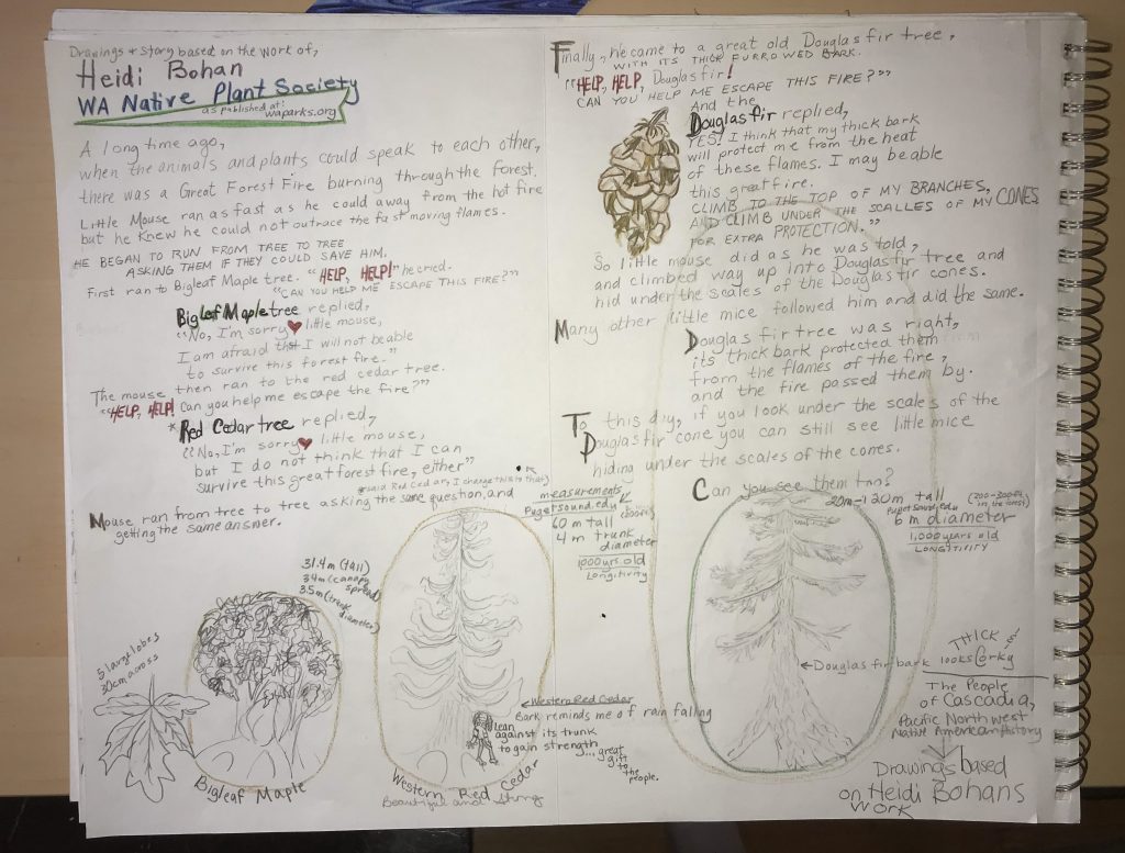 Douglas Fir shelters birds and my apartment complex in the back yard. I was surprised to find little mice hanging from her cones. This study lasted a year. First I drew a nature card and sent it to my cousin in Colorado, ultimately to become a lesson to present.